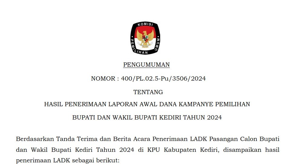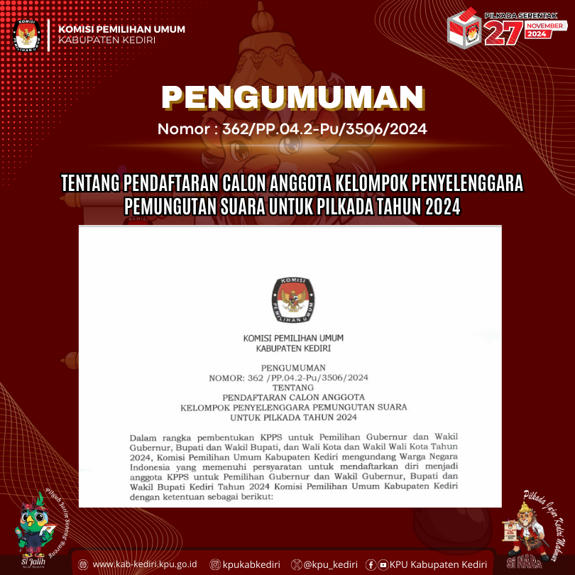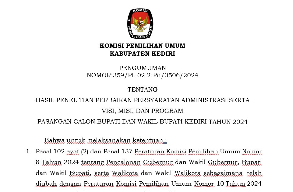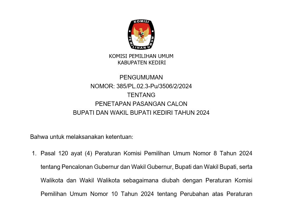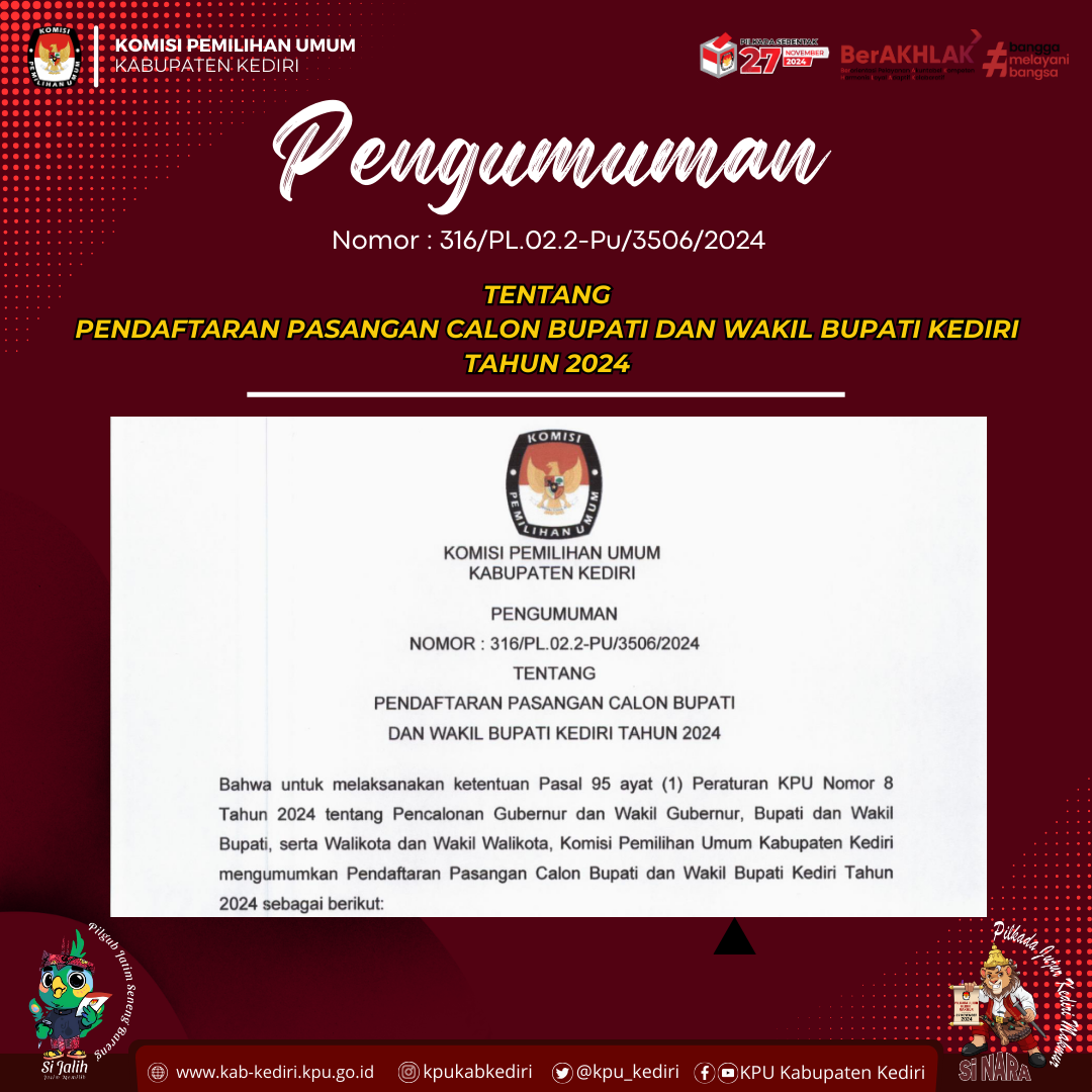 PENGUMUMAN PENETAPAN PASANGAN CALON BUPATI DAN WAKIL BUPATI KEDIRI TAHUN 2024 Minggu, 22 September 2024 12:00 135 PENGUMUMAN SELENGKAPNYA DAPAT DIAKSES DISINI SALINAN KEPUTUSAN PENETAPAN CALON BUPATI DAN WAKIL BUPATI KEDIRI TAHUN 2024 Baca Selengkapnya