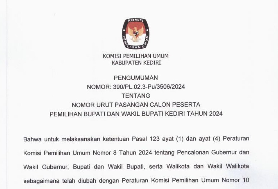 PENGUMUMAN PENETAPAN NOMOR URUT PASANGAN CALON PESERTA PEMILIHAN BUPATI DAN WAKIL BUPATI KEDIRI TAHUN 2024 Senin, 23 September 2024 22:00 97 PENGUMUMAN SELENGKAPNYA DAPAT DIAKSES DISINI SALINAN KEPUTUSAN PENETAPAN NOMOR URUT PASANGAN CALON BUPATI DAN WAKIL BUPATI KEDIRI TAHUN 2024 Baca Selengkapnya
