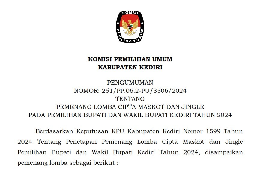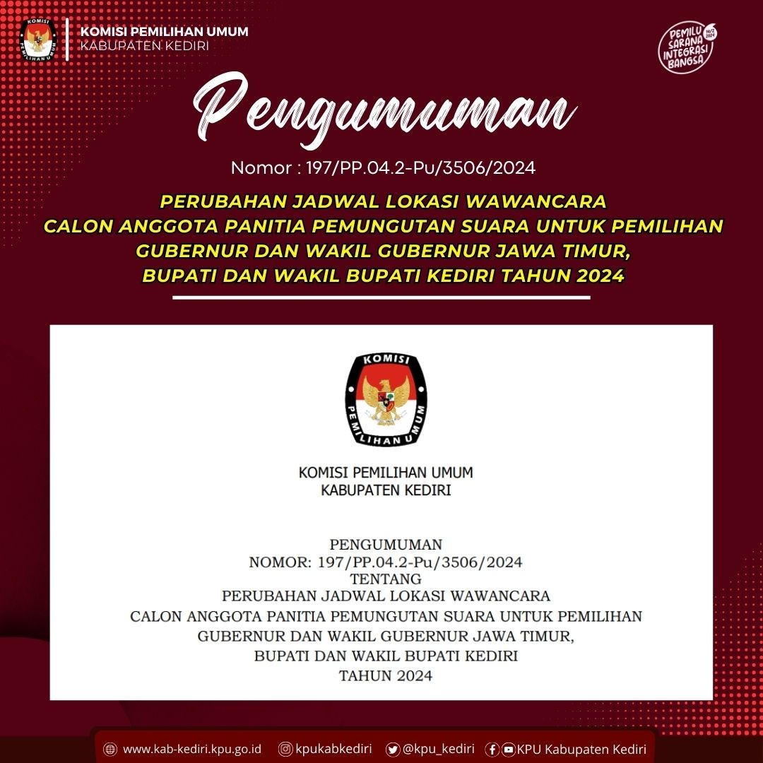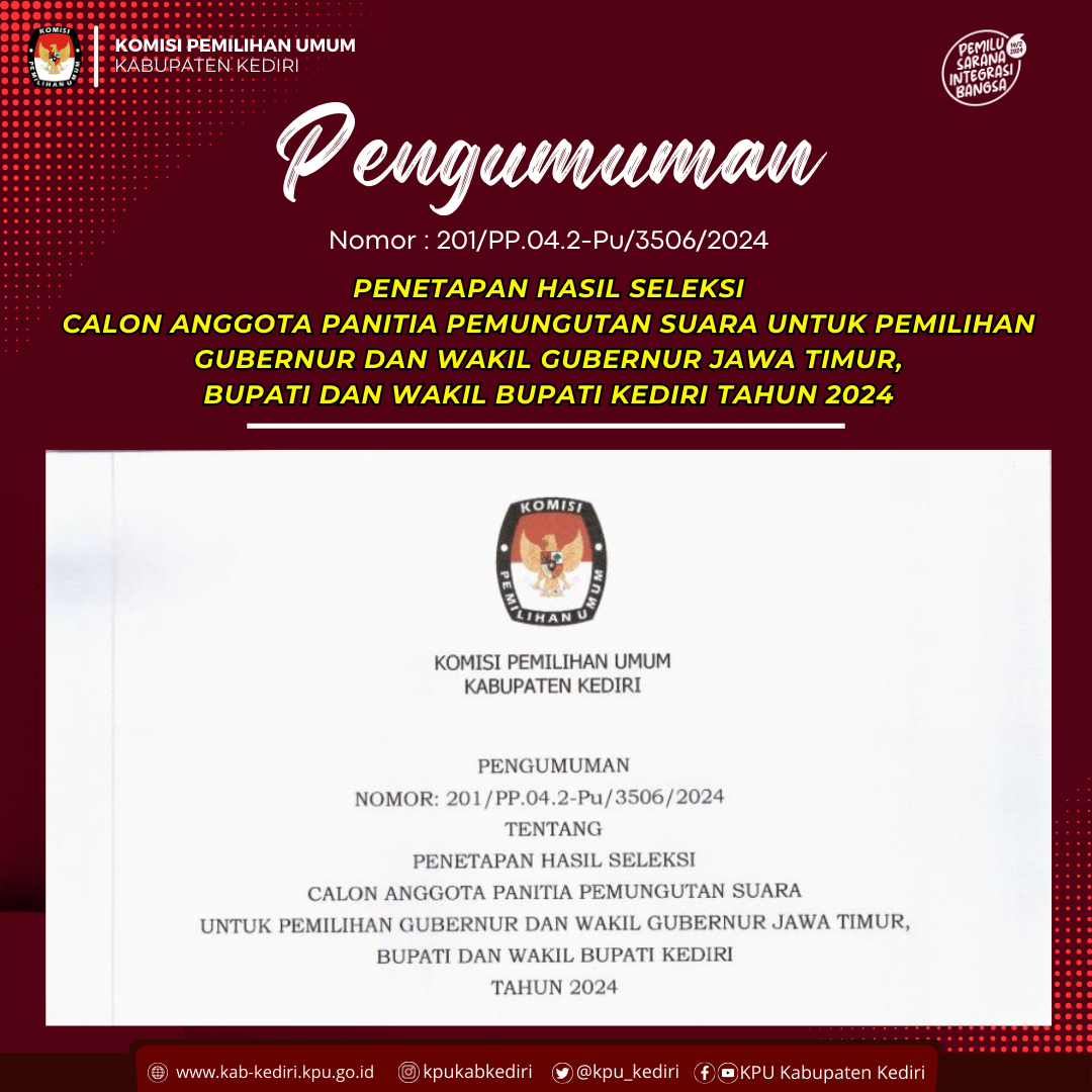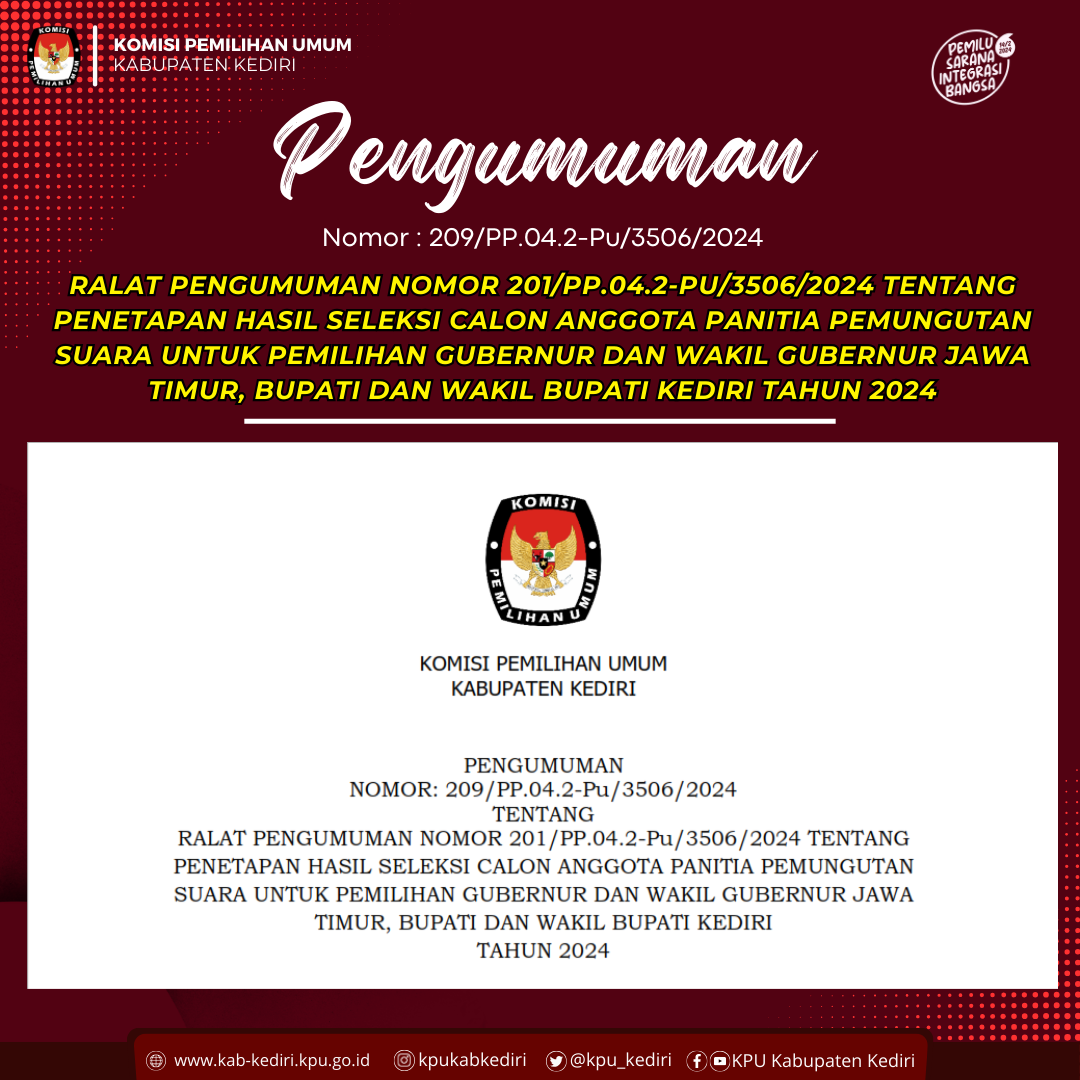 Kediri, kab-kediri.kpu.go.id - Pengumuman Nomor: 209/PP.04.2-Pu/3506/2024 Tentang Ralat Pengumuman Nomor 201/PP.04.2-Pu/3506/2024 Tentang Penetapan Hasil Seleksi Calon Anggota Panitia Pemungutan Suara untuk Pemilihan Gubernur Dan Wakil Gubernur Jawa Timur, Bupati Dan Wakil Bupati Kediri Tahun 2024......KLIK DISINI
