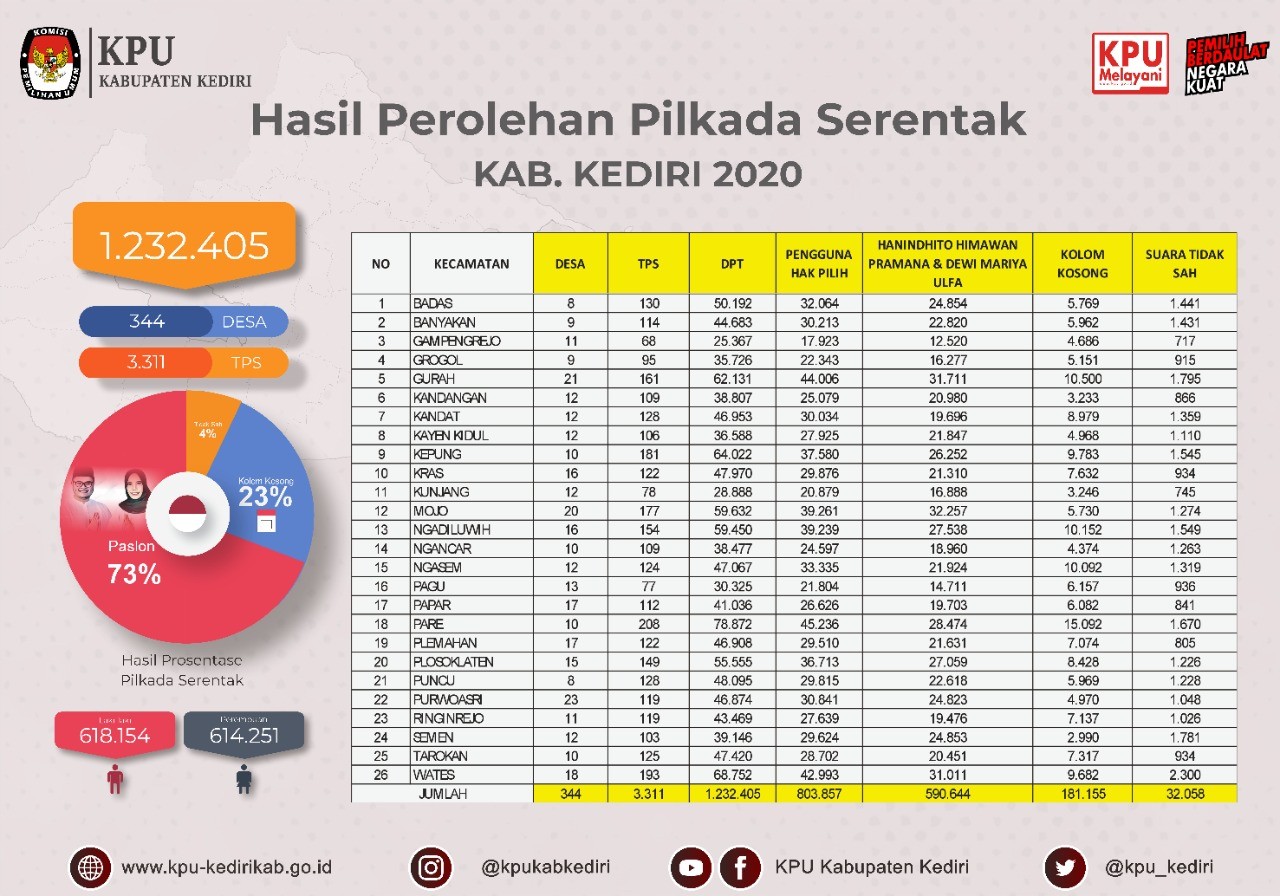 Hasil Perolehan Pilkada Serentak Kabupaten Kediri Tahun 2020